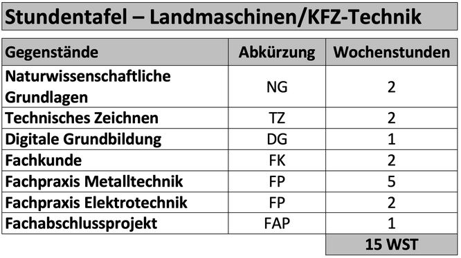 Im Fachbereich Landmaschinen und KFZ-Technik steht alles im Zeichen moderner Fahrzeugtechnik. Die Schülerinnen und Schüler lernen, wie Motoren, Maschinen und Fahrzeuge aufgebaut sind, wie sie funktionieren und wie sie fachgerecht gewartet oder repariert werden. Im praxisorientierten Unterricht arbeiten sie an realen Fahrzeugkomponenten, erstellen Schaltpläne, führen Messungen durch und nutzen moderne Diagnosesoftware. Neben der klassischen Mechanik spielt auch die Elektrotechnik in Fahrzeugen eine wichtige Rolle. Dazu gehören die Fehlersuche im Bordnetz, das Verständnis elektronischer Systeme und die Einführung in die Elektromobilität. Durch die enge Zusammenarbeit mit regionalen Werkstätten und Landmaschinenbetrieben erleben die Schülerinnen und Schüler hautnah, wie vielfältig und zukunftsorientiert dieser Berufszweig ist. Teamarbeit, Genauigkeit und technisches Verständnis werden dabei besonders gefördert und bilden die Grundlage für eine erfolgreiche berufliche Zukunft.